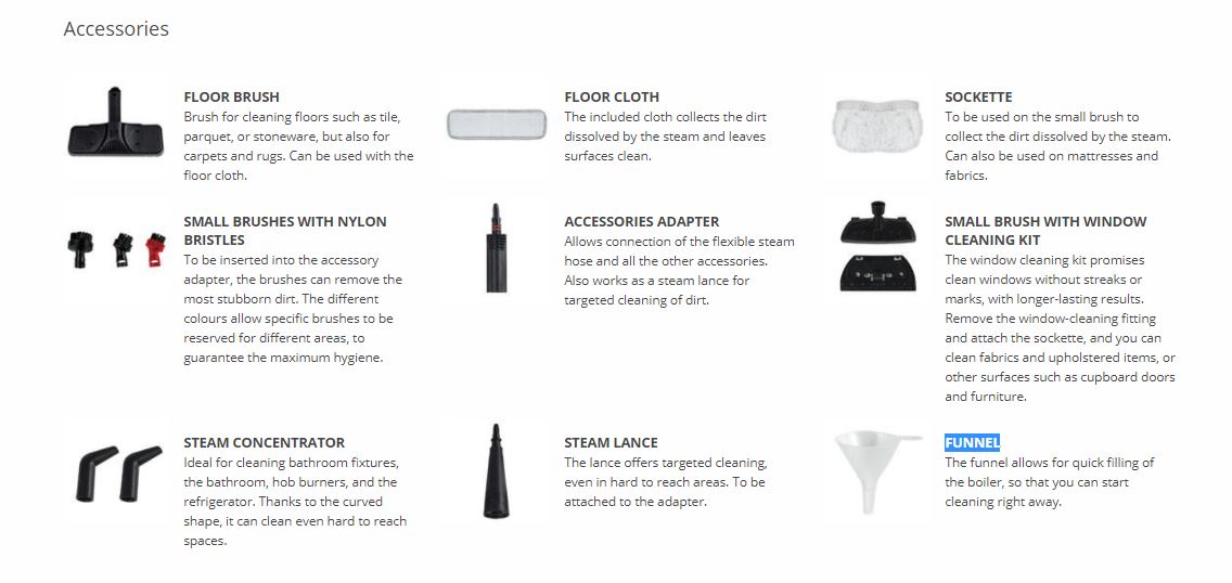 • Accessories included12 included accessories: floor brush, floor cloth, sockette, small brushes with nylon bristles, accessories adapter, small brush with window cleaning kit, steam concentrator, steam lance, funnel