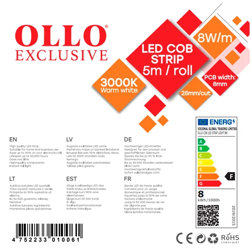 OLLO / 05-9501 / LED Lente / 3000К - silti balta / IP20 / 8 W/m / 800 lm/m / 320 LED/m / COB Lente