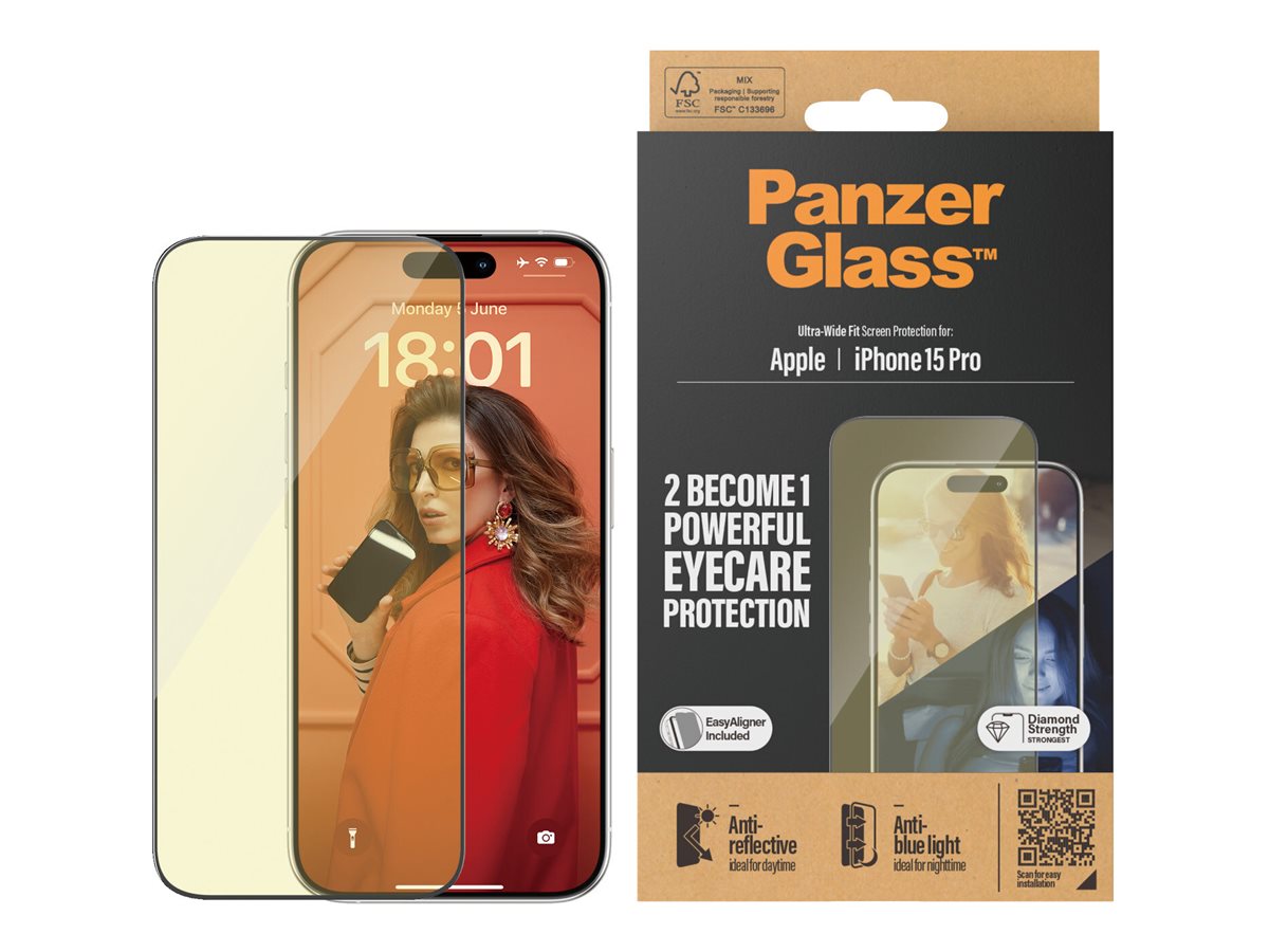 PanzerGlass | Screen protector | Apple | iPhone 15 Pro | Glass | Clear | Ultra-Wide Fit; Easy installation; Fingerprint resistant; Anti-blue light; Anti-reflective; Anti-yellowing | Eyecare