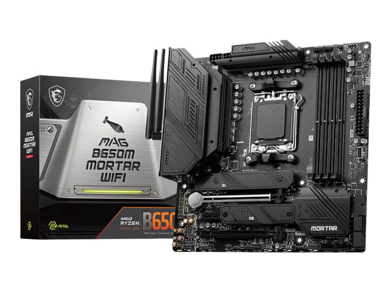 MSI | MAG B650M MORTAR WIFI | Processor family AMD | Processor socket AM5 | DDR5 DIMM | Memory slots 4 | Supported hard disk drive interfaces SATA, M.2 | Number of SATA connectors 6 | Chipset AMD B650 | mATX