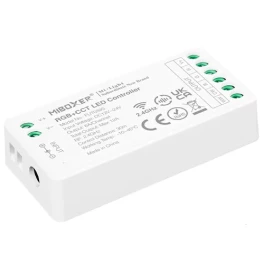 LED контроллер RGBW 12-24 В постоянного тока 12 А Milight FUT039S — это улучшенная версия устройства FUT039, позволяющая легко управлять LED освещением RGBW. С помощью этого небольшого устройства вы можете регулировать интенсивность света, цвет и цветовую температуру подключенной светодиодной ленты RGB+CCT. Управлять им можно с помощью пульта или приложения для смартфона, но для последнего необходим Wi-Fi-мост WL-BOX2. Контроллер может работать в двух частотных режимах: высоком (8 кГц) или низком (500 Гц).