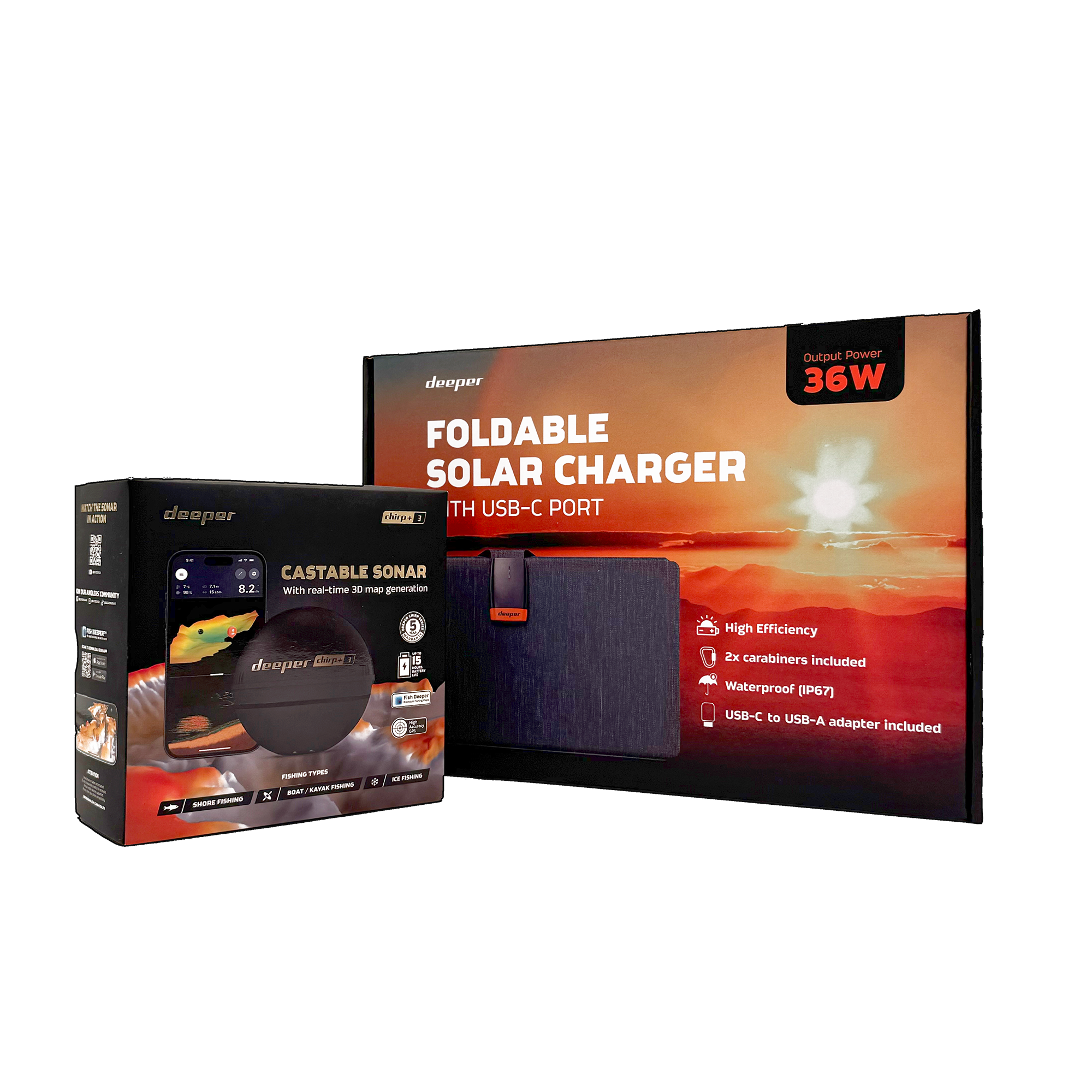 Other featuresExperience the freedom to sh smarter and longer with the ultimate bundle, our most advanced castable sonar CHIRP+ 3 paired with a powerful 36W foldable solar charger. Together, they deliver unmatched accuracy on the water and unlimited energy o-grid, so anglers never have to cut their adventure short.